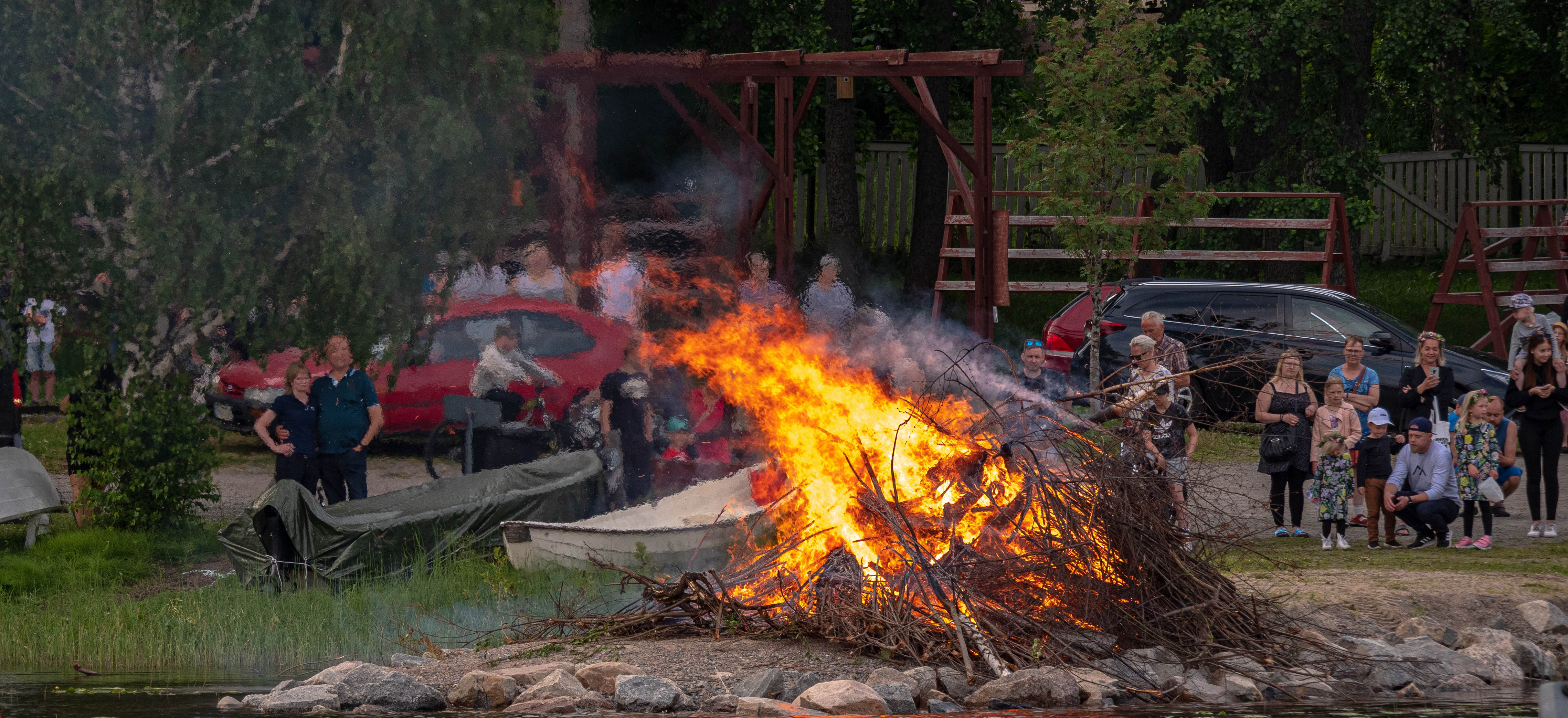 Muuten päivä sujuu varsin idyllissävyisissä ja rauhallisissa tunnelmissa. Nautimme pitkästä saunavuorostamme. Kerrankin ei tarvitse kytätä kelloa ja hätäillä oman vuoron päättymistä ihan liian aikaisin! Sitten uusia perunoita, mansikoita ja vähän sihi- että punaista juotavaa. Kokko syttyy ja ihmisiä (ynnä koiria) saapuu juhlistamaan keskikesää kuka milläkin kulkuneuvolla. Pääskynen juttelee Marjukan ankkuriliinalla. Terassilla on live-musaa. Mikäs on ollessa! Tarvinneeko mainitakaan, että on kovasti lämmintä koko ajan.