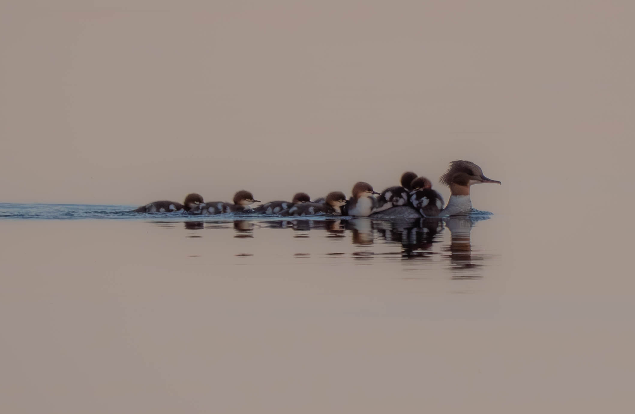 Vietämme Iso-Tuunaassa kokonaisen päivän ennen kuin matka jatkuu. Päivä kuluu meloessa ja muissa hellepäivään sopivaisissa touhuissa. Vaihdan kuvausvälineen vaihteeksi Lumixiin ja telezoomiin. Istuskelen Marjukan takakannella hellettä pidellen ja etsimen läpi näkyy laivaliikennettä ja lintuliikennettä. Mm. kaksi koskeloemoa, joista toisella on yksi poikanen vanavedessään ja toisella kahdeksan. Näky saa mielikuvituksen liikkeelle ja pään hetkeksi surumieliseksi.